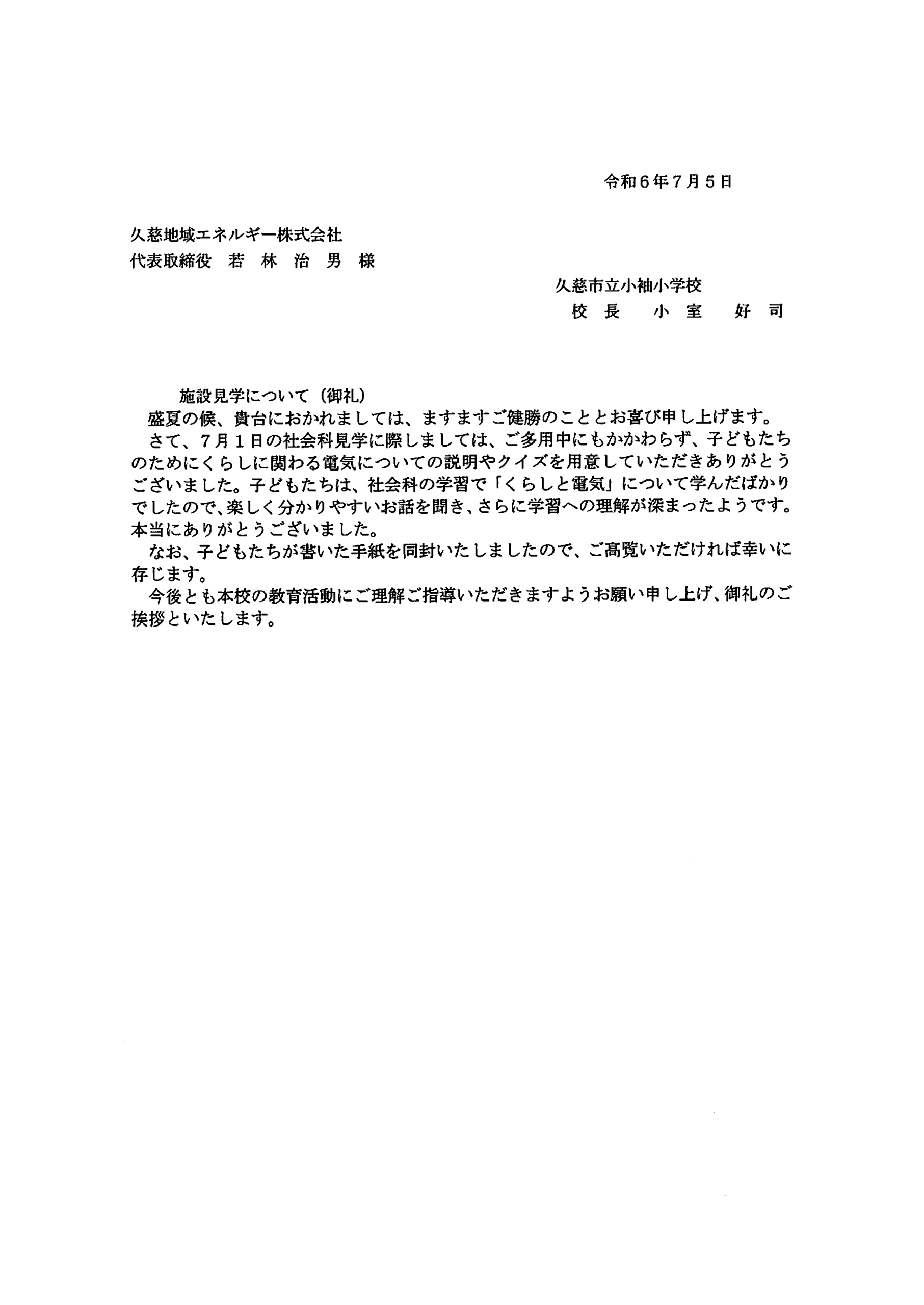 2024年7月1日 久慈市立小袖小学校の4年生の皆さん(4名)が施設見学に来ていただきました。